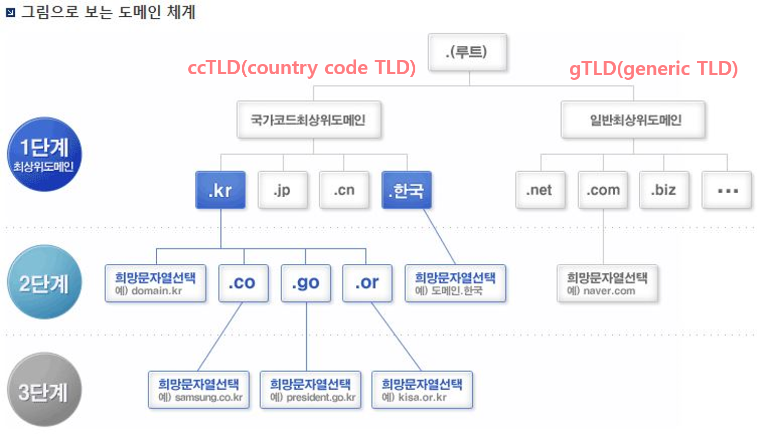 우리나라는. kr을 사용하며 하위 도메인으로 co.kr(일반회사), ac.kr(교육기관), re.kr(연구기관), go.kr(정부기관), seoul.kr(지역이름) 등이 있다.
