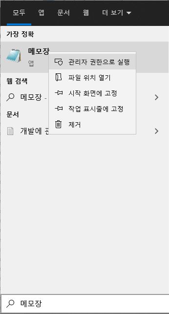 메모장을 관리자 권한으로 실행한 뒤 hosts 파일을 불러와 수정후 저장한다.