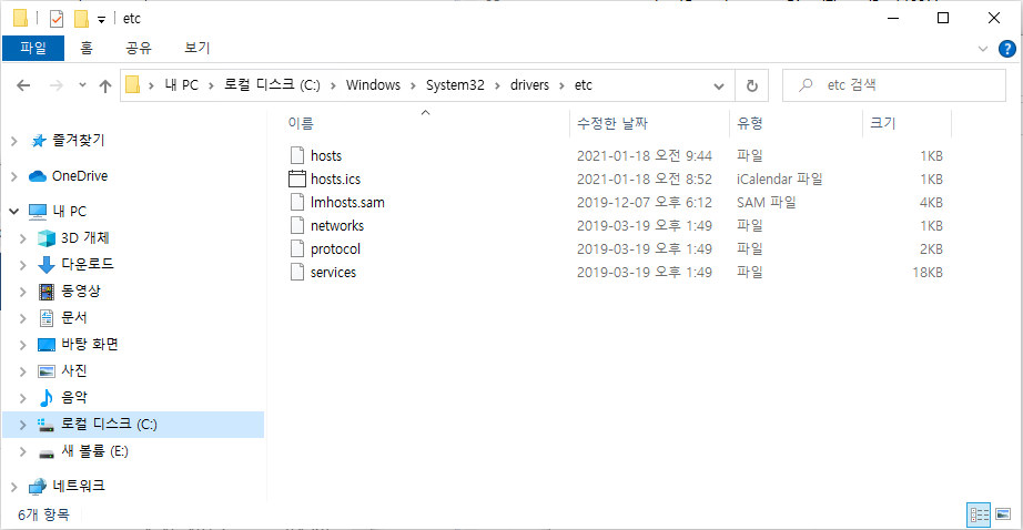 hosts파일을 다른 곳(권한이 필요 없는 폴더 - 바탕화면 등) 으로 이동 후 수정하고 다시 원 위치로 이동시킨다.
