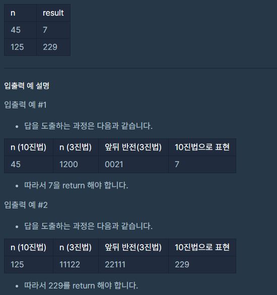 자연수 n이 매개변수로 주어집니다. n을 3진법 상에서 앞뒤로 뒤집은 후, 이를 다시 10진법으로 표현한 수를 return 하도록 solution 함수를 완성해주세요.