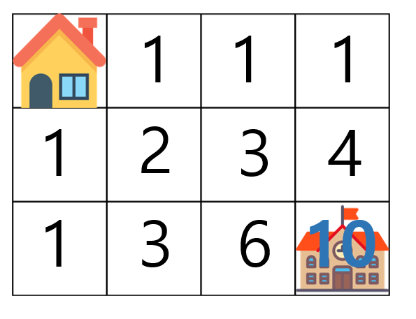 이를 바탕으로 예시와 같은 경우 등굣길 경로의 수를 그림으로 나타내었다.