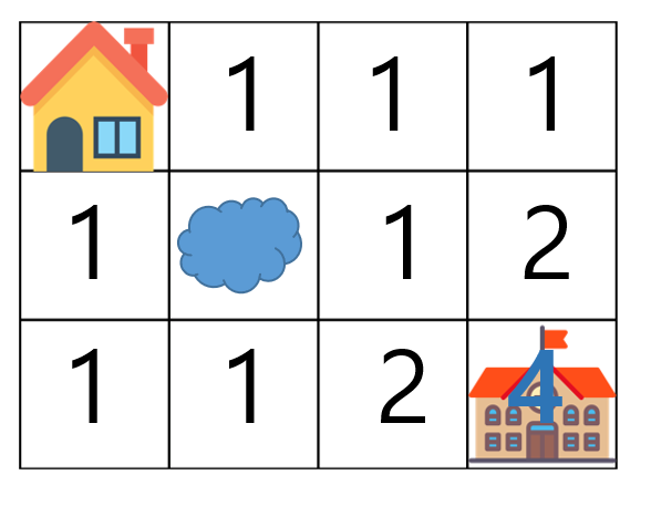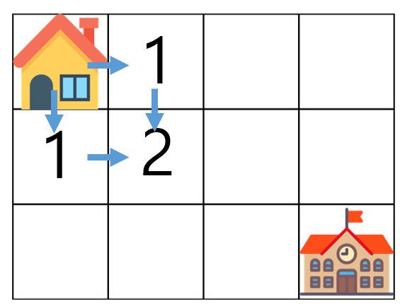 집에서 학교로 갈 때 오른쪽 or 아래로 한 칸씩 이동하도록 되어있기 때문에