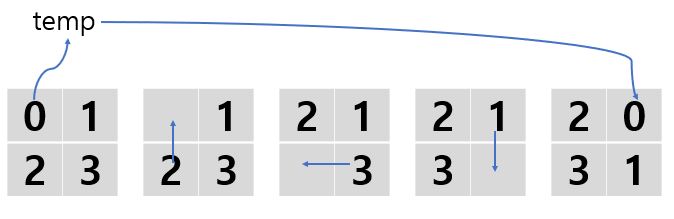 처음 값을 temp에 저장해 두고 반복문을 반시계 방향으로 돌면서 배열의 다음 값을 현재 위치에 넣어주는 과정을 반복하다 마지막 위치에 temp에 저장했던 값을 다시 넣어주는 방식으로 구현했습니다.
