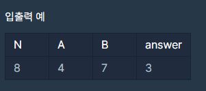 이때, 처음 라운드에서 A번을 가진 참가자는 경쟁자로 생각하는 B번 참가자와 몇 번째 라운드에서 만나는지 궁금해졌습니다. 게임 참가자 수 N, 참가자 번호 A, 경쟁자 번호 B가 함수 solution의 매개변수로 주어질 때, 처음 라운드에서 A번을 가진 참가자는 경쟁자로 생각하는 B번 참가자와 몇 번째 라운드에서 만나는지 return 하는 solution 함수를 완성해 주세요. 단, A번 참가자와 B번 참가자는 서로 붙게 되기 전까지 항상 이긴다고 가정합니다.