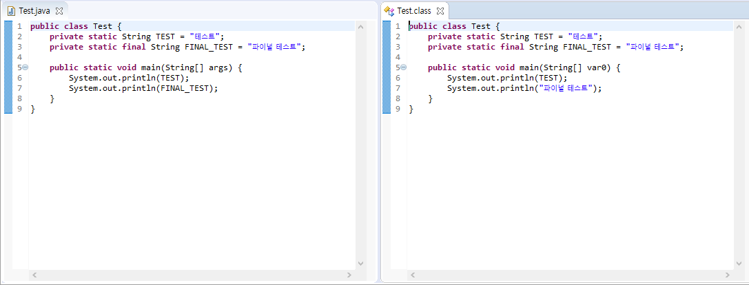 왼쪽 자바파일을 컴파일하여 생성된 클래스파일을 디컴파일러를 통해 열어보니 오른쪽 Test.class와 같았다.