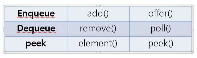 이 중 add, remove, element는 큐가 비어있거나 꽉 차 있을 때 예외가 발생하고
